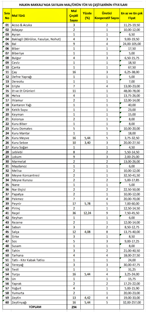 İkinci veri setinde ise, “Halkın Bakkalı” dükkanlarında satılan toplam 294 adet ürün ve malzemenin hangi kooperatiflerden alındığı ve satış fiyatlarının ne olduğu gösteriyordu.