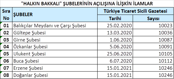 Ancak açılan her bir “Halkın Bakkalı“, İzmir Büyükşehir Belediyesi’nin şirketi Grand Plaza Gıda Turizm A.Ş.‘nin şubesi olarak kabul gördüğü için bu şubelerin açılışları ile ilgili ilamları yayınlayan Türkiye Ticaret Sicili Gazetesi bize bu konuda bir fikir veriyor.