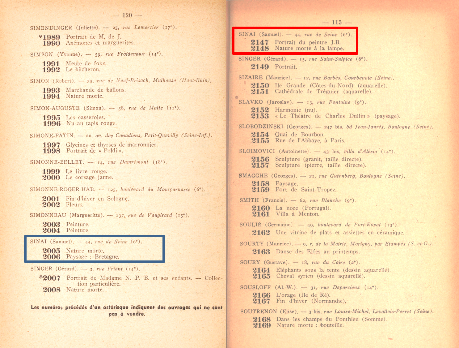 Bağımsız Sanatçılar Topluluğu’nun 1950 ve 1951 yıllarında Ėlysėes Sarayı’nda açtığı sergilerin kataloğunda Samuel Sinai