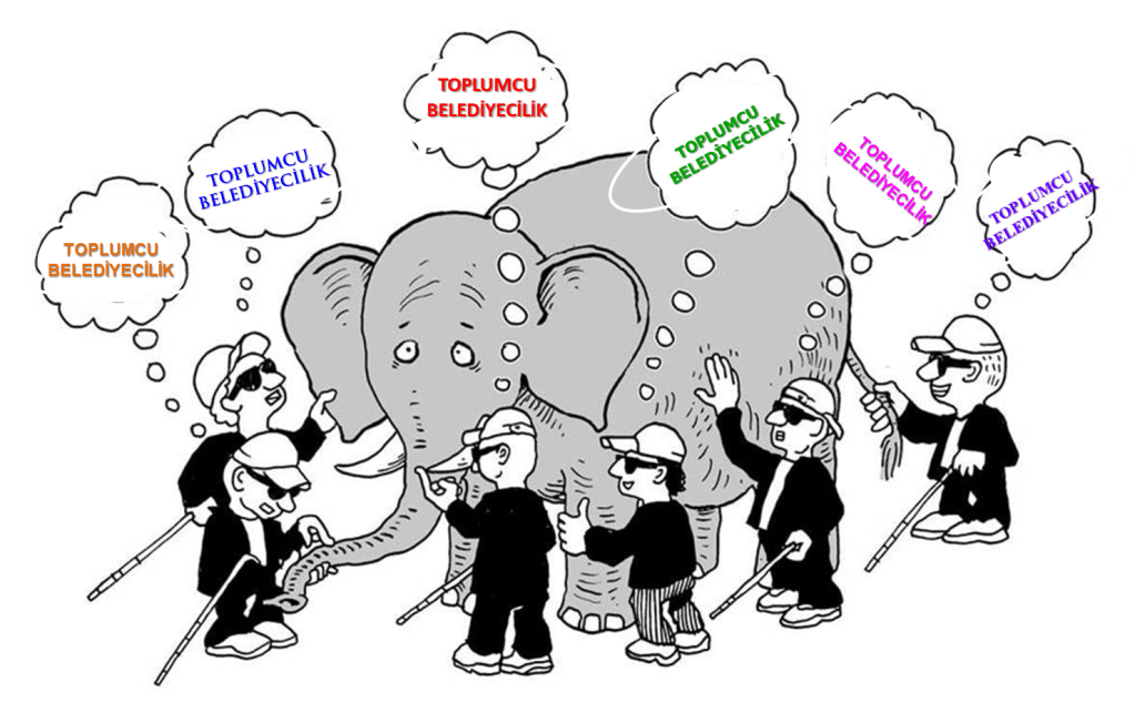 1) Anladığım kadarıyla toplumcu belediyecilik kavramı, dinlediğimiz 15 konuşmacının kendine, durduğu yere, ilgi duyduğu konuya, sahip olduğu düşünce, ideoloji ve siyasi görüşe göre değişen bir kavram… Bu nedenle, aynen “kör adam ve fil” öyküsünde olduğu gibi herkesin filin farklı bir yerine dokunarak bir diğerinden farklı yorumlar yaptığını görmüş olduk… Hele ki, uygulama içinde yer almayıp bu işi sadece okuyarak ve ders vererek öğrenenler açısından…