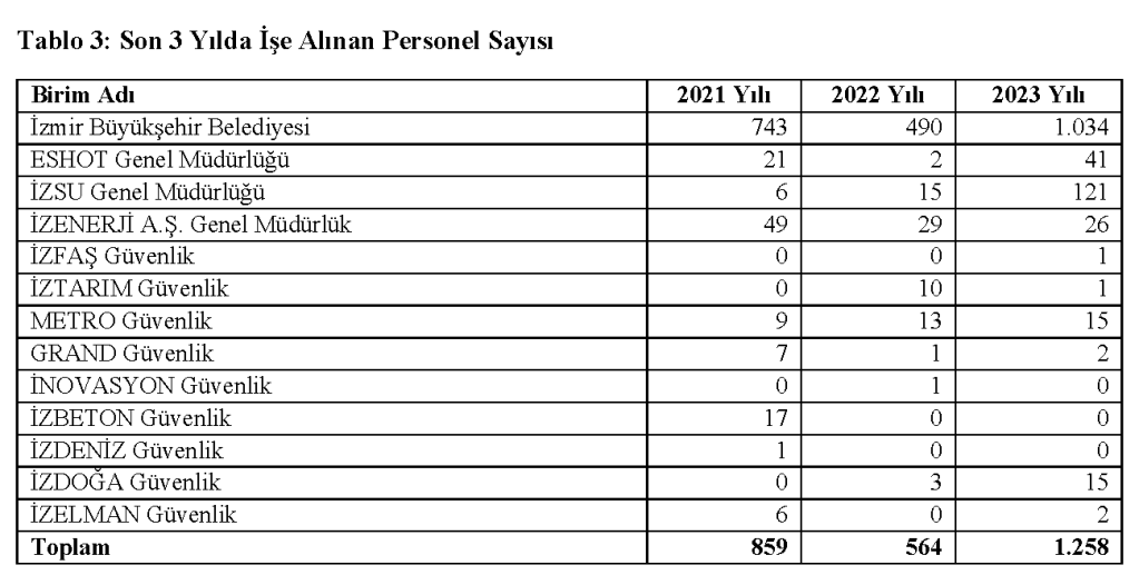 🔺2023 Sayıştay Denetim Raporu’na eklenen yukarıdaki tabloya göre, İZENERJİ şirketiyle bu şirket üzerinden İzmir Büyükşehir Belediyesi ve belediyeye bağlı ESHOT ve İZSU genel müdürlüklerinde; ayrıca 10 belediye şirketinde son 3 yılda çalışanların ortalama sayısı 2021 yılı itibariyle 10.338’i, 2022 itibariyle 10.583’ü, 2023 yılı itibariyle 11.520’yi bulmaktadır.