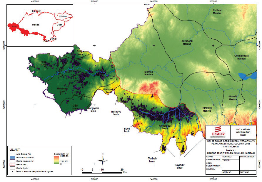 2014 yılı DSİ verilerine göre Menemen ve Çiğli bölgesindeki su kuyuları ( (Kaynak: Gediz Havzası NHYP Hazırlanması Projesi Nihai NHYP Raporu, TÜBİTAK MAM ÇTÜE)
