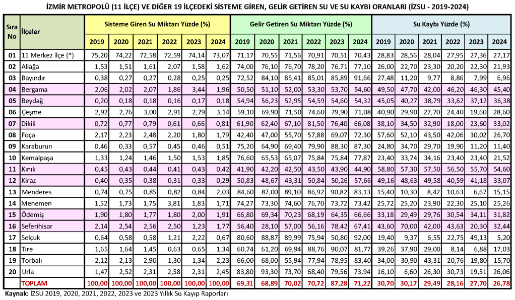 Kayıp-kaçak konusundaki ortalama 8 yıllık 2017-2024 döneminde olumlu bir şekilde %3,70 oranında azalmış olmakla birlikte; su şebekesine verilen su miktarı ile gelir getiren su miktarını, su kayıp miktarını ve kişi başına düşen su miktarlarını ilçeler ölçeğinde sayısal ve oransal düzeyde gösteren aşağıdaki iki ayrı tablodan da görüleceği üzere; 2019-2024 döneminde İzmir‘in büyük ve önemli ilçelerinden Bergama, Dikili, Ödemiş ve Seferihisar ile Beydağ, Kınık ve Kiraz gibi nispeten küçük ilçelerdeki kayıp-kaçak oranları bu ortalamanın çok üstünde bir seyir izlemekte ve yıllar içinde bu oranlarda belirgin bir azalış görülmemektedir.