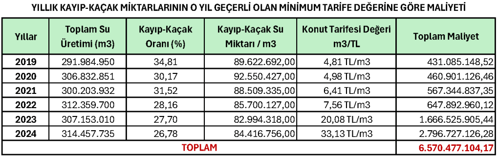İzmir‘deki içme suyu şebekesinde kaybolan suyun miktarını o yılkı en düşük tarife değeri üzerinden hesapladığımızda karşımıza çıkan minimum maliyet ise aşağıdaki tabloda gösterilmiş olup; su kıtlığının çekildiği yıllarda bu rakamın biz kullanıcılar için paha biçilemez düzeylere yükseldiği söylenebilir: