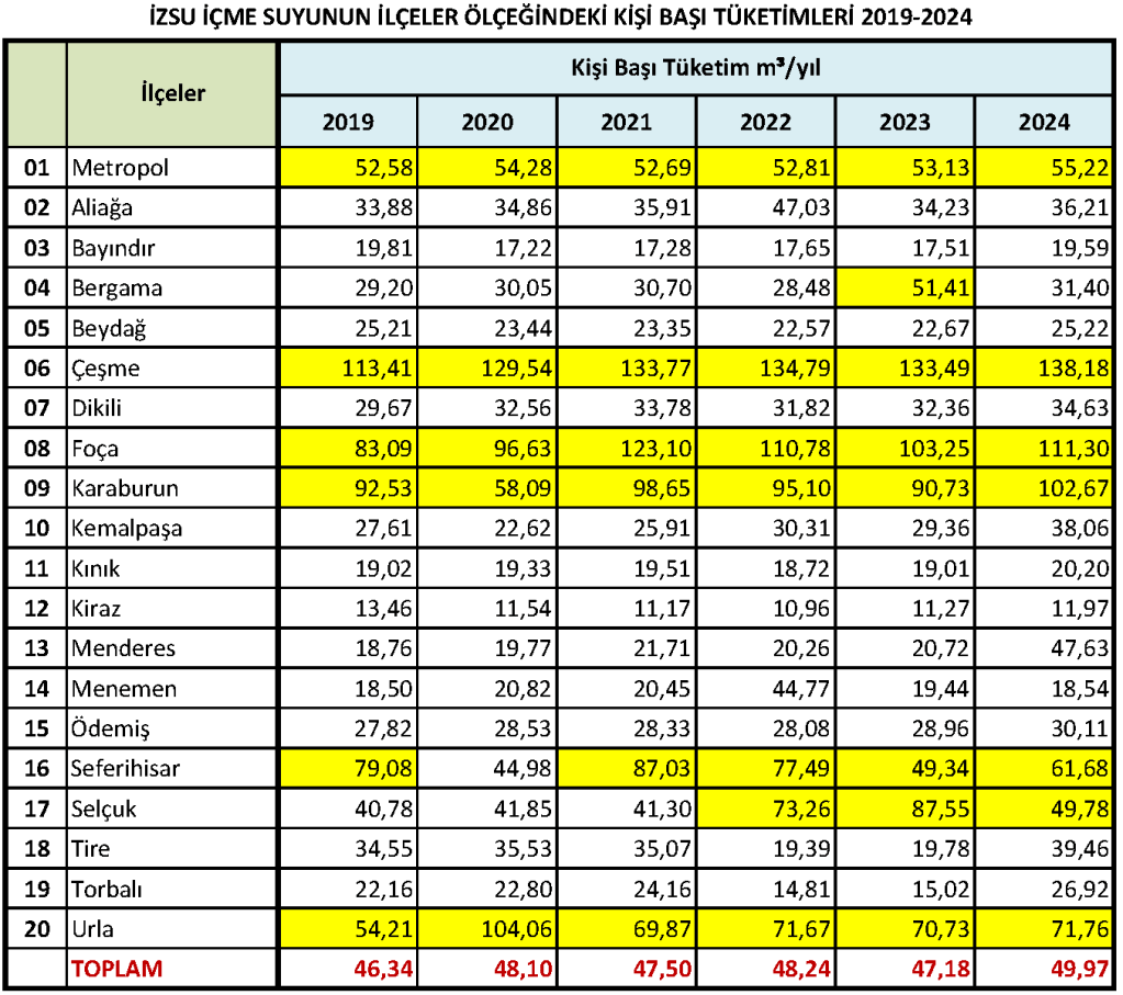 İZSU‘nun, kent merkezindeki 11 ilçeden oluşan metropol ile diğer 19 ilçeye verdiği gelir getiren su miktarını o yerleşimlerde yaşayan nüfusa bölerek bulanacak kişi başına düşen içme suyu tüketim miktarlarını incelediğimizde metropoldeki nüfusla Çeşme, Foça, Karaburun, Seferihisar, Selçuk ve Urla gibi sahil ilçeleri nüfusunun diğer ilçelere göre çok daha fazla içme suyu tükettiği görülecektir.