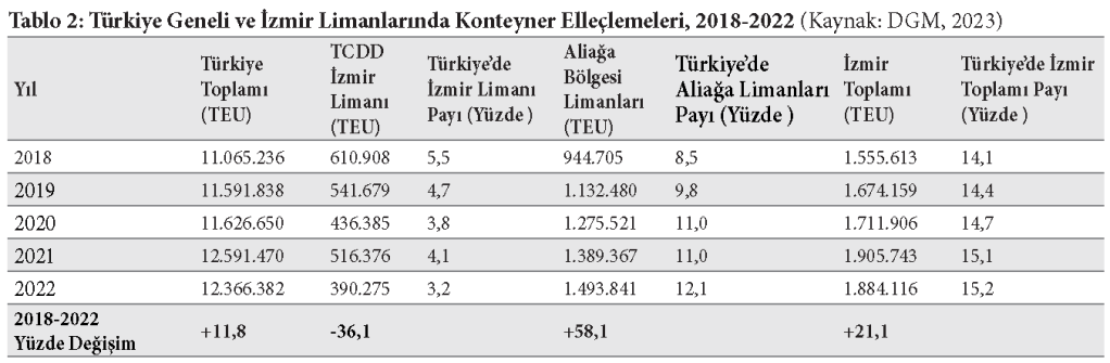 2018-2022 döneminde konteyner elleçleme konusunda Türkiye’deki limanlar %11,8, Aliağa bölgesi limanları %58,1 oranında gelişme gösterirken İzmir Limanı -%36,1 oranında gerileme gösteriyor.