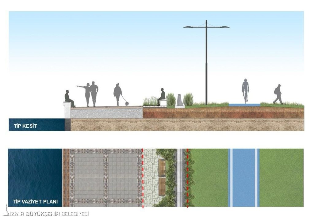 Yapılan açıklamaya eklenen ilginç bir görsel var. Bu görselde “tip kesit” ve “tip vaziyet planı” adı altında sahilde/yeşil alanda yapılacak işler ayrıntılı olarak gösterilirken, düz bir çizgi halinde işaretlenen deniz bölümü hakkında tek bir bilgi verilmiyor ya da tek bir açıklama yapılmıyor!