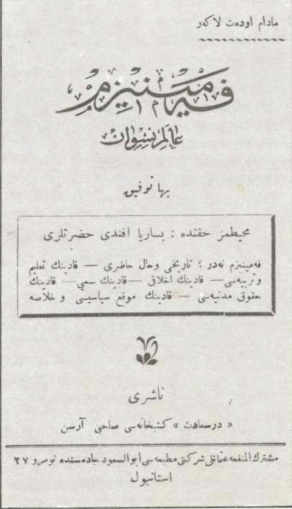 8. Feminizm, Alem-i Nisvan (Odette Lacquerre’den çev.), İstanbul: 1328 (1912), Müşterekülmenfaa Osmanlı Şirketi Matbaası, 85 s. Teceddüd-i İlmî ve Felsefî Kütüphanesi adet:5.