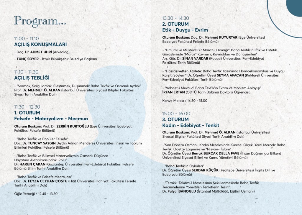 Evet, hepsi de üniversitelerden gelen, çoğu bu işin başındaki iki profesörün tanıdığı, akademik hiyerarşi içinde kendilerinden daha düşük akademik unvanlara sahip, muhtemelen öğrencisi ya da daha önce birlikte çalıştığı, Dr. Berrak Burçak Della Fave ve Dr. Fulya İbanoğlu gibi bugüne kadar Bahâ Tevfik konusunda kalem oynatmamış akademisyenlerden oluşan bir kadrodan İzmirli Bahâ Tevfik‘i dinleyeceğiz bu konferansta… Ama sadece felsefeci yanının öne çıkarıldığı, zengin kişiliğini oluşturan diğer yanlarını temsil eden kurum ve kişiler tarafından dile getirilmediği bir ortamda…