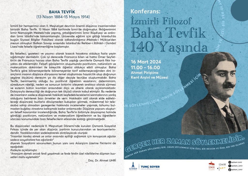 İzmir’in kültür ve sanatla ilgili kent belleğini tazelemek amacıyla kaleme aldığım “İzmir’in Unutulan Sanatçıları” isimli yazı dizisinin devam ettiği süreç içinde, Bahâ Tevfik‘in ve eserlerinin, İzmir Büyükşehir Belediyesi tarafından sahiplenilerek adının ona layık bir kültür merkezine verilmesini ve onunla ilgili etkinliklerin yapılmasını arzuladığım için, 16 Mart 2024, Cumartesi günü İzmir Büyükşehir Belediyesi Ahmet Piriştina Kent Arşivi ve Müzesi (APİKAM)‘nde yapılacak olan “İzmirli Filozof Baha Tevfik 140 Yaşında” başlıklı konferansın gerçekleştirilmesi için girişimde bulunduğumu ve söz konusu etkinliğin bu girişimin olumlu bir sonucu olduğunu ifade etmek isterim.