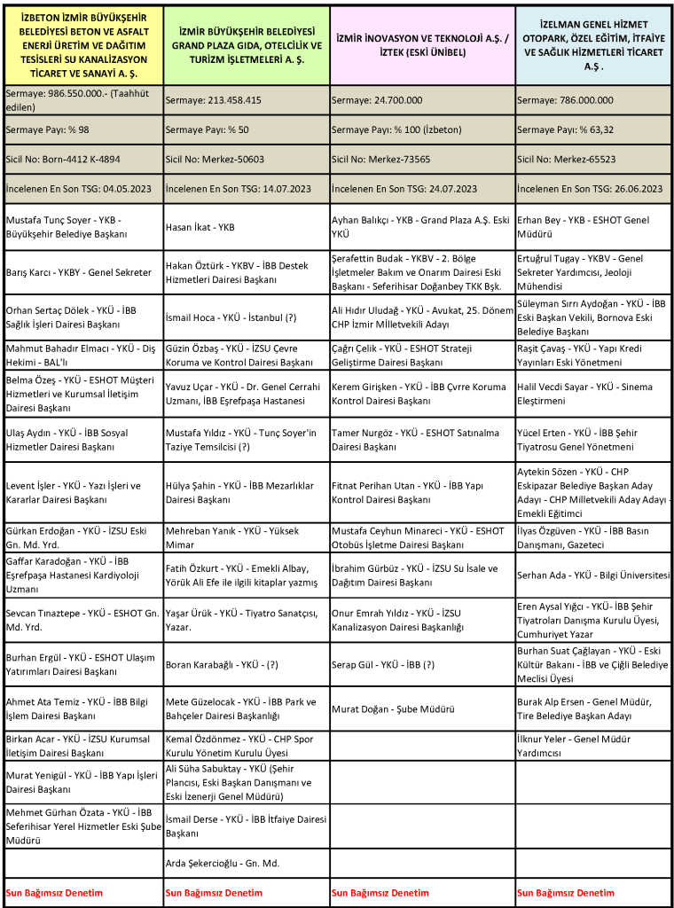 Ele aldığımız toplam 23 belediye şirketindeki toplam 234 adet yönetim kurulu başkanlığı ya da üyeliği pozisyonunun yine toplam 217 kişi tarafından doldurulduğunu; bunun 78‘inin Belediye Başkanı Tunç Soyer‘in yetkisi dışında kalan pozisyonlar olduğu, geriye kalan 139‘unun da doğrudan doğruya İzmir Büyükşehir Belediye Başkanı Tunç Soyer tarafından belirlendiği, bu belirleme işleminin şirket genel kurulu ya da yönetim kurulları tarafından bu karara dönüştürüldüğü görülmüştür. Yapılan incelemeler sonucunda Belediye Başkanı tarafından belirlenen 98 (% 70,51) ismin belediye çalışanı, 41’inin (% 29,49) de belediye dışından isimler olduğu ortaya çıkmıştır.