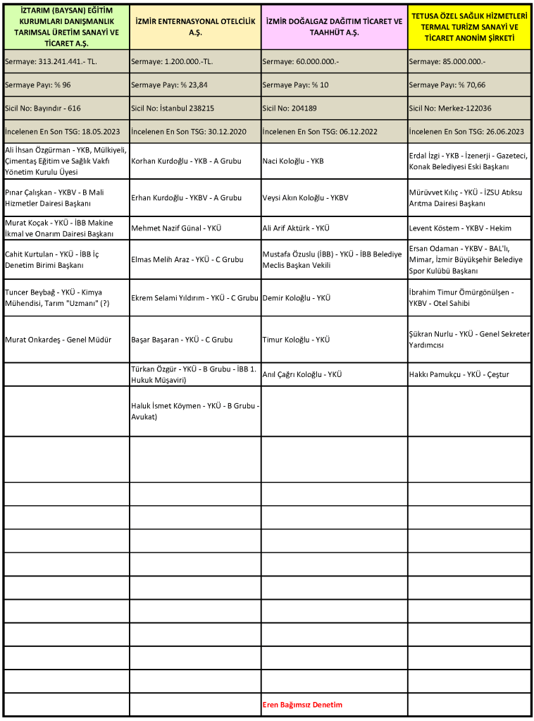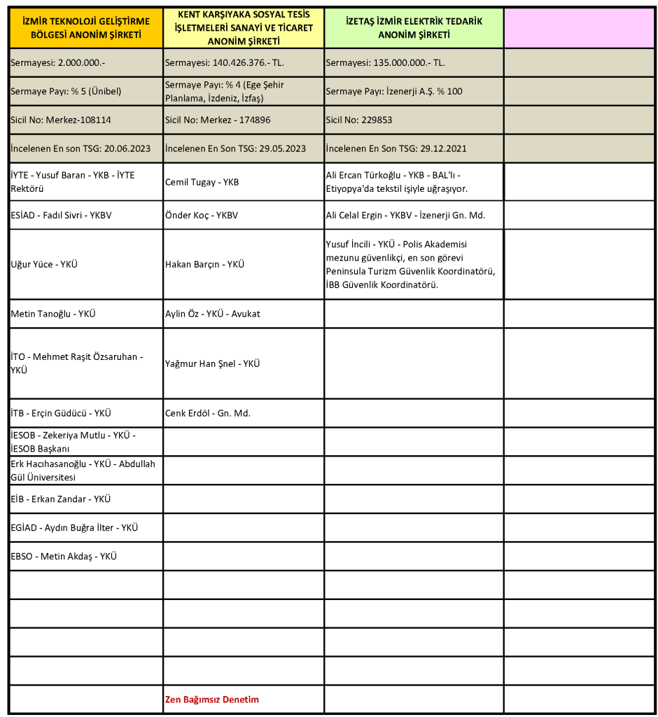 Gelelim bu şirketlerin yönetim kurullarında kimlerin yer aldığı konusuna… Ama bunu yapmadan önce, yaptığımız inceleme ve analizlerde söz konusu şirketlerin İnternet sayfalarındaki “Bilgi Toplumu Hizmeti” bölümüyle Türkiye Ticaret Sicili Gazetesi‘ndeki duyurulardan, İzmir Büyükşehir Belediyesi‘ne ait İnternet sayfasındaki “Birimlerimiz” bölümünden; ayrıca, Google‘da yaptığımız tarama bilgilerinden, özellikle bazı yönetim kurulu üyelerinin kişisel Linkedin sayfalarından yararlandığımızı ifade etmek isteriz. Tabii ki bu tarama ve inceleme çalışmaları sırasında bazı şirketlerin “Bilgi Toplumu Hizmeti” sayfalarının çalışmadığını, bu sayfalardaki bilgilerin güncel olmadığını, çoğu şirketin İnternet sayfasında şirket yönetim kurullarında görev yapan kişiler hakkında açıklayıcı bilgilere yer vermediğine tanık olduğumuz için isimlerini yazdığımız kişilerin iş yaşamındaki meslekleri konusunda yanlışlıklar yapma ya da eksik bilgiler verme gibi hatalarımızın olabileceğini baştan belirtmemiz gerekiyor. Haliyle bilgi edinmenin bu kadar zor olduğu, bilgiye adeta iğneyle kuyu kazarcasına ulaştığımız bir ülkede bunun hoş karşılanacağını umuyor, gelecek doğru bilgilerle yanlışlıklarımızı düzeltip eksikliklerimizi gidereceğimizi ifade etmek istiyorum. Örneğin mesleklerini, daha önce neler yaptığını, nereden geldiğini bir türlü öğrenemediğimiz Grand Plaza A.Ş. yönetim kurulu üyeleri İsmail Hoca ve Boran Karabağlı ya da İZDEDA – İzmir Depremzedeleri Dayanışma Derneği‘nin eski başkanı olup olmadığından emin olamadığımız İzmir Metro A.Ş. yönetim kurulu üyesi Haydar Özkan veya İzmir İnovasyon ve Teknoloji A.Ş. yönetim kurulu üyesi Serap Gül örneğinde olduğu gibi.