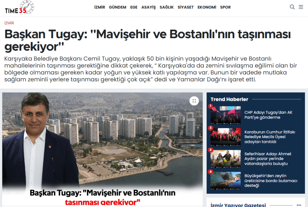 8) “Uçuk” ve de “kaçık” fikirleriyle tanıdığımız Karşıyaka Belediye Başkanı Cemil Tugay, 2023 yılının Şubat ayında hiçbir araştırmaya dayanmaksızın ve bu işin yapılabilirliğini düşünmeden “Bostanlı ve Mavişehir Yamanlar’a taşınmalı” fikriyle öne çıkarak “uçuk” ve “kaçık” fikirlerine bir yenisini katmış, aynen dönmedolap fikrinde olduğu gibi bir gece önce rüyasında gördüğü bir hayali binlerce yapıda binlerce insanın yaşadığı bir bölgeyi hiçbir çevre kaygısı taşımadan Yamanlar‘a taşıyalım diyerek ortaya çıkmış, gerçeklik algısından ne kadar kopuk bir belediye başkanı olduğunu kanıtlamıştır.