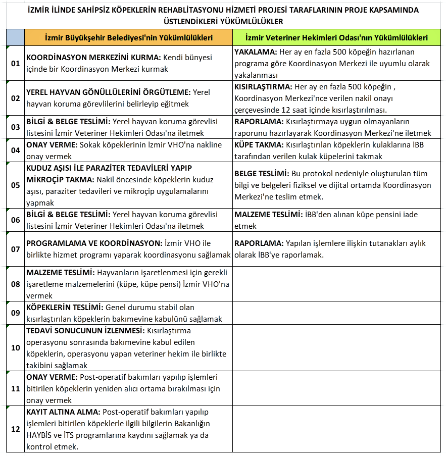 Toplam (10) maddeden oluşan protokolün diğer maddelerini incelediğimizde, protokolün 6. maddesinde İzmir Büyükşehir Belediyesi ile Veteriner Hekimleri Odası İzmir Şubesi‘nin karşılıklı yükümlülüklerinin yazılı olduğu görülmektedir. Bu karşılıklı yükümlülükler aşağıdaki tabloda gösterilmiştir.