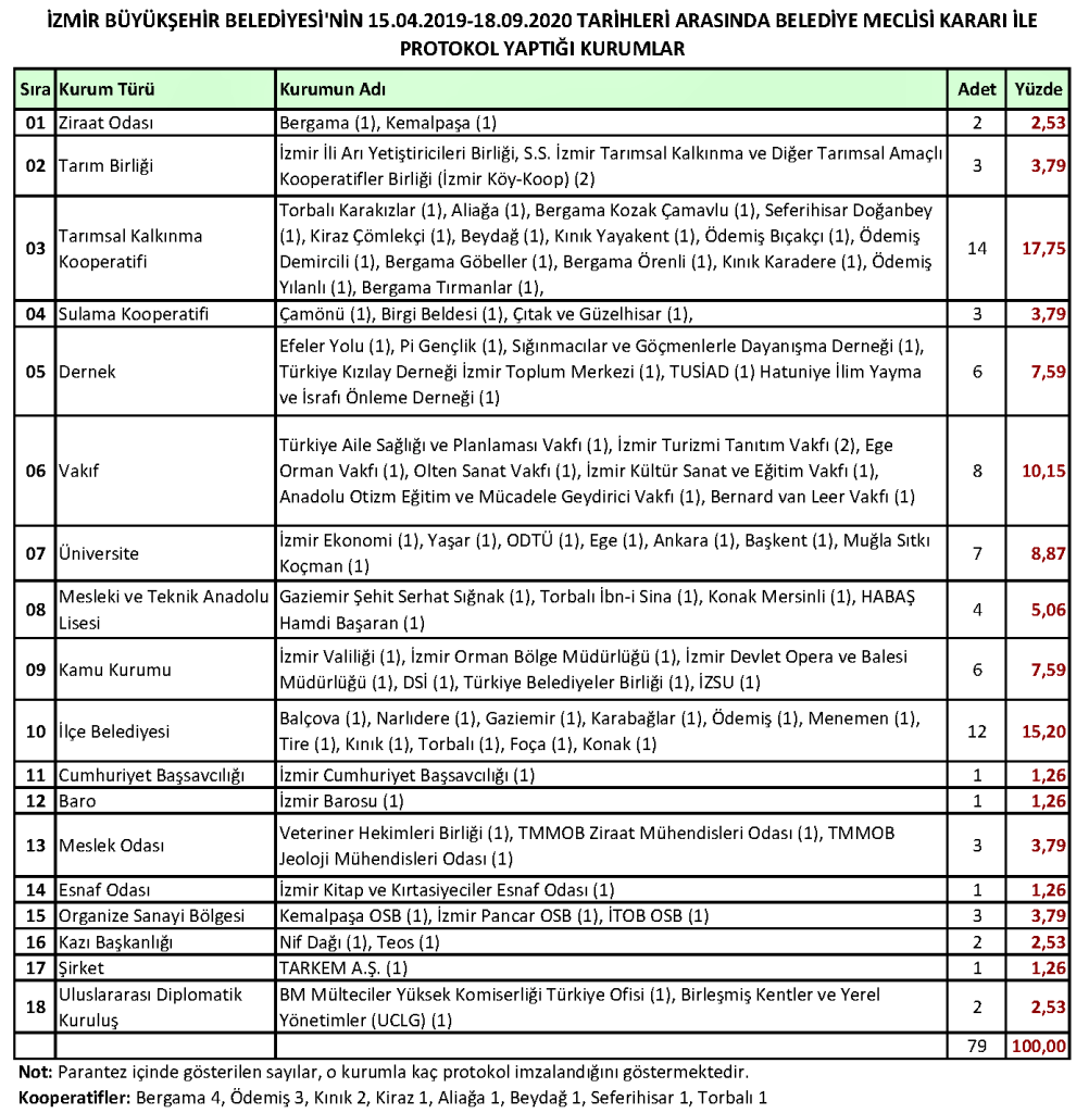 Bu çalışmanın sonuçlarını sizinle paylaşmadan önce söylemeliyim ki; Seferihisar Belediye Başkanı iken En Şeffaf Belediye Ödülü‘nü alıp 2019 seçimleri öncesinde Uluslararası Şeffaflık Derneği‘nin Şeffaflık Taahhütnamesi‘ni imzalayan İzmir Büyükşehir Belediye Başkanı Mustafa Tunç Soyer‘in hizmet döneminde, birlikte çalışma ya da işbirliği yapma kararı alınan veya yardım edilen kurum ve kuruluşlarla imzalanan protokollerin hiç biri ne belediye meclisi kararı ne de komisyon raporunun eki olarak paylaşılmamış durumda. O nedenle, değişik kurum ve kuruluşlarla imzalanan protokollerin şeffaf olmadığını, bu metinlerdeki düzenlemelerin kamuoyu tarafından bilinmediğini söyleyebiliriz.