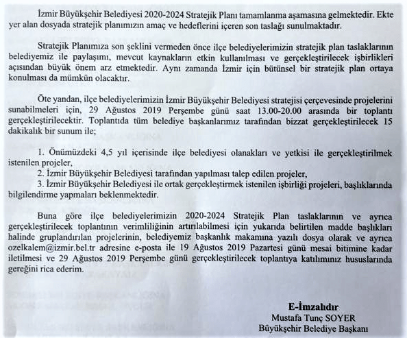 Bizzat İzmir Büyükşehir Belediye Başkanı Mustafa Tunç Soyer tarafından imzalanan bu yazıda her ilçe belediyesinden, 2020-2025 hizmet döneminde kendi ilçesinde yapacağı projeler hakkında bilgi istenmekte ve doğrudan doğruya İzmir Büyükşehir Belediyesi tarafından yapılmasını arzuladıkları projelerle İzmir Büyükşehir Belediyesi ile birlikte yapılması istenen işbirliği projeleri ile ilgili önerileri sorulup, üç grup halinde hazırlanacak bu proje önerilerinin 19 Ağustos 2019 tarihine kadar yazılı olarak bildirilmesi ve 29 Ağustos 2019 tarihinde İzmir Büyükşehir Belediye Başkanı ile tüm ilçe belediye başkanlarının katılacağı toplantıda sunulması isteniyordu.