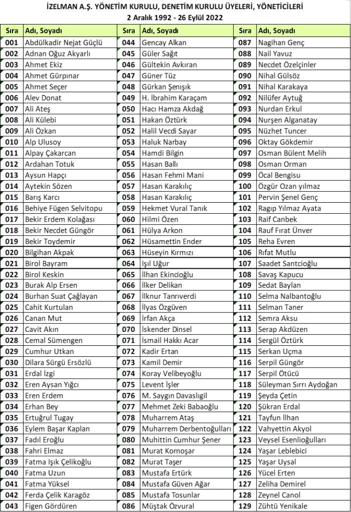 İZELMAN Yönetim kurulu üyeleri ve üst yöneticileri, 2.12.1992-26.09.2022