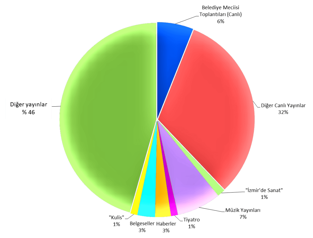 📌 Farklı türdeki videoların süreleri itibariyle toplam içindeki dağılımı ise şu şekildedir: Belediye meclisi toplantısı canlı yayınları % 17,00 (57 saat, 14 dakika, 38 saniye), fuar, zirve, çalıştay, turnuva, açılış töreni gibi nedenlerle yapılan diğer canlı yayınlar % 54,26 (189 saat, 19 dakika, 21 saniye), “İzmir’de Sanat” isimli program % 1,20 (4 saat, 12 dakika, 29 saniye), müzik yayınları % 10,44 (36 saat, 25 dakika, 42 saniye), tiyatro yayınları % 1,58 (5 saat, 32 dakika, 24 saniye), “Haberler” % 0,47 (1 saat, 39 dakika, 57 saniye), belgeseller % 1,03 (3 saat, 36 dakika, 36 saniye)”Kulis” isimli program % 1,75 (6 saat, 6 dakika, 50 saniye), diğer yayınlar % 12,27 (44 saat, 45 dakika, 24 saniye).