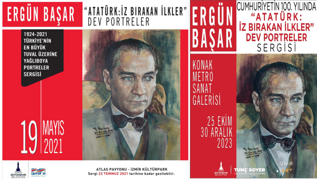 İzmir Büyükşehir Belediyesi tarafından 25 Ekim-30 Aralık 2023 tarihleri arasında “Cumhuriyetin 100. Yılında Atatürk: İz Bırakan İlkler Dev Portreler Sergisi” adıyla Konak Metro Sanat Galerisi‘nde açık kalan ve Ergün Başar‘ın yaptığı büyük boyutlu portrelerden oluşan sergideki (sergi kataloğunda yer alan portrelerin üstündeki yapım tarihlerine göre) 84 adet büyük boy portreden 53’ünün daha önce 19 Mayıs-23 Temmuz 2021 tarihleri arasında Kültürpark Atlas Pavyonu‘nda “Atatürk: İz Bırakan İlkler Dev Portreler” adıyla sergilendiğini bildiğim için bu portreleri yapan sanatçıya ait aynı eserlerinin İzmir Büyükşehir Belediyesi tarafından 2021 ve 2023 yıllarında iki kez sergilenmesi nedeniyle yerel iktidar katında muhabbetle kabul görüp desteklenen bir sanatçı olduğunu anlamam zor olmamıştı.