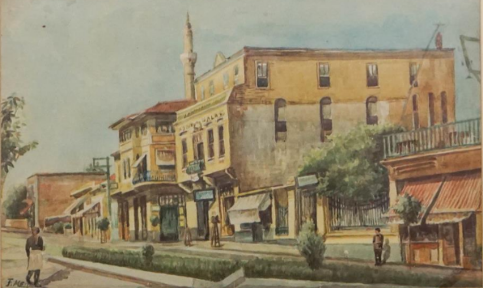 Fuad (Fuat) Mensi Dileksiz 1880-1965 – Dükkanlar ve Figürlerle Sokak Manzarası Kağıt Üzerine Suluboya 12,14X20,14 inç.