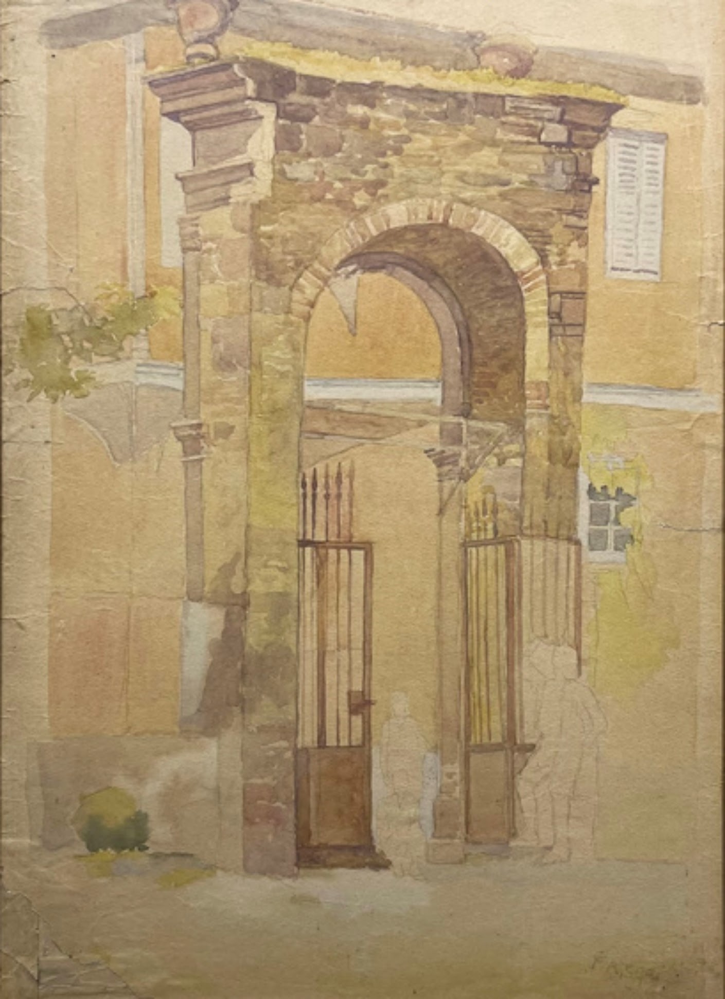Fuad (Fuat) Mensi Dileksiz 1880-1965, Tarihî Kapı, Kağıt üzerine suluboya – 79×62 cm çerçeve, 50×35 cm resim ebatları. Kenarlarında dönem restorasyonunun izleri mevcut.