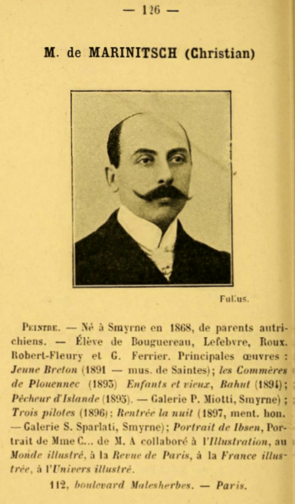 Ressam ve illüstratör Christian de Marinitsch‘in 1868’de Avusturyalı bir ailenin çocuğu olarak İzmir’de dünyaya geldiği bilinmekle birlikte, bu kentte hangi tarihe kadar yaşadığı, ne zaman, ne şekilde Fransa’ya gittiği bilinmemektedir.