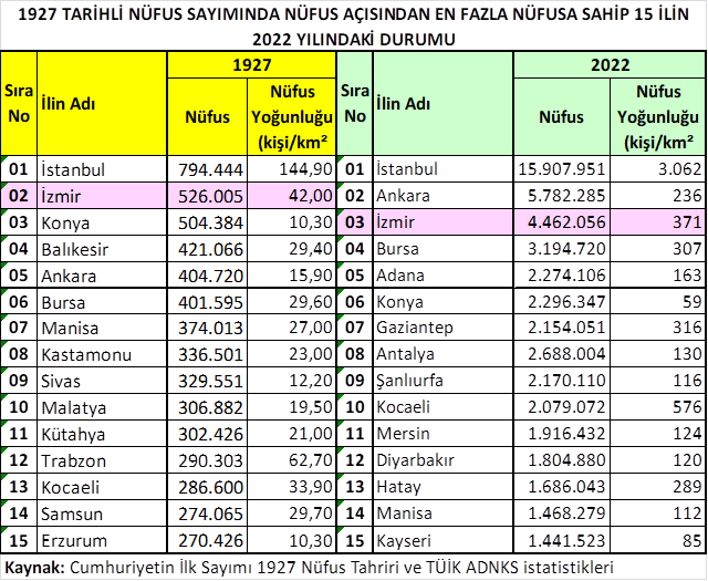 Günümüzde ise, 1927’de sahip olduğu 526.005 kişilik nüfusu ile Türkiye’nin en kalabalık ikinci ili olan İzmir, 2022 yılı ADNKS verilerine göre 4.462.056 kişilik nüfusu ile 81 il arasında İstanbul ve Ankara’dan sonra üçüncü sıradadır. Nüfus yoğunluğu ise 111 km²/kişi’lik Türkiye ortalamasına göre 371 km²/kişilik ortalama değer ile 81 il arasında 3.062 km²/kişilik ortalama değere sahip İstanbul ve 576 km²/kişilik ortalama değere sahip Kocaeli‘den sonra 371 km²/kişilik ortalama değer ile üçüncü durumdadır.