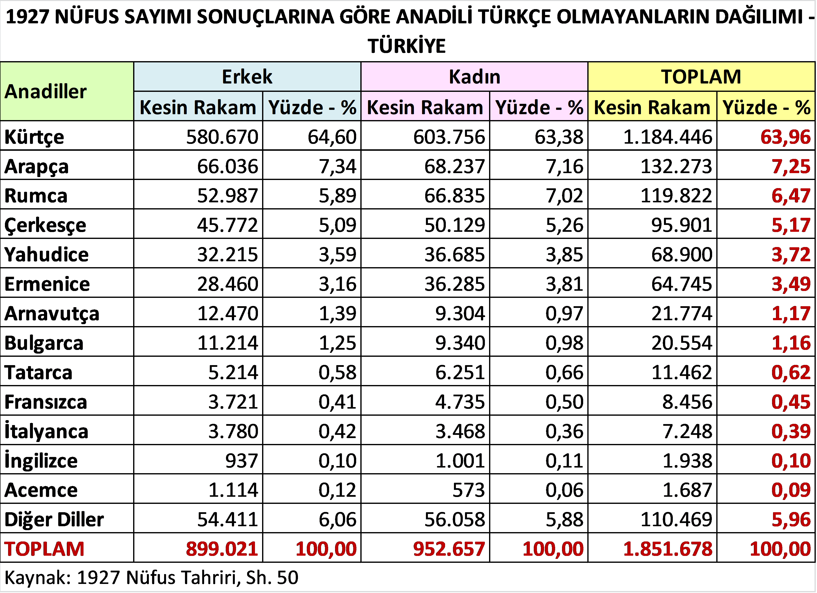 1927 nüfus sayımına göre, toplam nüfusun % 86,42’si anadil olarak resmi dil Türkçe’yi, geriye kalan % 13,58’i ise Türkçe dışındaki diğer anadilleri kullanmaktadır. Türkçe dışındaki anadilleri kullananların Türkiye nüfusu içindeki oranı Kürtçe için % 8,69, Arapça için % 0,98, Rumca için % 0,88, Yahudice için % % 0,51, Ermenice için % 0,48, Çerkezce için % 0,70, Arnavutça için 0,16, Bulgarca için % 0,15, Tatarca için % 0,09, Fransızca için % 0,07, İtalyanca için % 0,06, İngilizce için % 0,02, Acemce için % 0,02 ve ve diğer yabancı anadiller için % 0,81’dir.