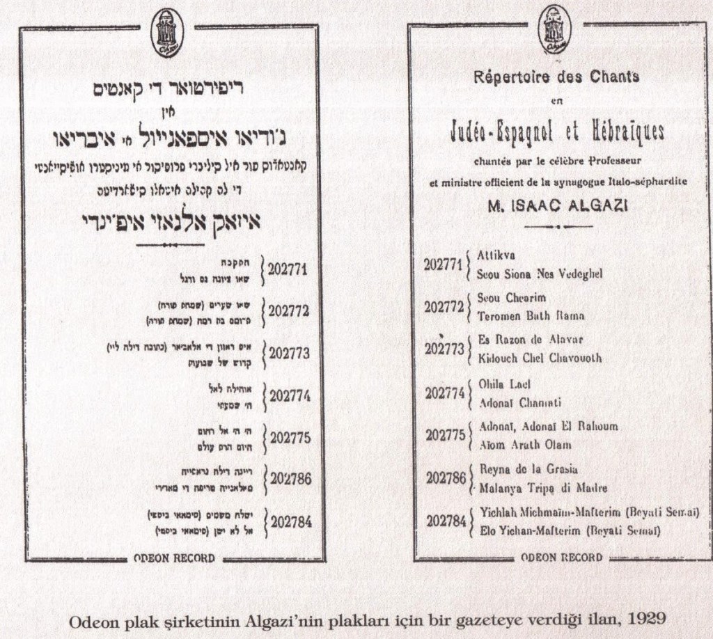İzak Algazi‘nin okuduğu şarkıları ise, ağızdan ağıza aktarılıp bugüne gelen ya da kendisine mal edilen parçalarla notaya alınmış eserlerden ve 78 devirli plaklardan tanıyoruz.