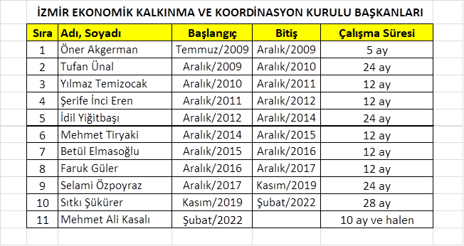 İzmir Ekonomik Kalkınma ve Koordinasyon Kurulu‘nu, kuruluşundan bu yana titizlikle takip eden biri olarak, bu kurulda ilk günden bugüne başkan ve üye olarak toplam 250 kişinin görev yaptığını, 20 Haziran 2022 tarihli toplam 143 kişilik üye listesinin yakın zamanda İzmir Büyükşehir Belediye Başkanlığı‘nca listeye yeni kişilerin eklenmesi suretiyle değiştirilmesi sonrasında çoğu üyenin liste dışında bırakıldığını ve böylelikle toplam üye sayısının 82’ye indirildiği görülmektedir.